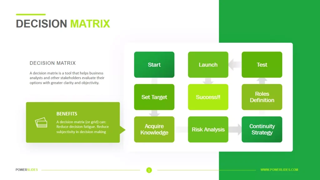 A decision-making matrix, also known as a decision matrix or a criterion matrix, is a tool for evaluating and comparing several possibilities or alternatives using a set of criteria. It entails establishing a matrix with options as rows and criteria as columns.